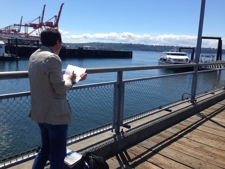 We had a recent celebrity sighting on the West Seattle route of the Water Taxi! The Seattle Sketcher (aka Seattle Times artist Gabriel Campanario) played tourist for a day with his family. He shares the souvenirs of his trip with readers at the Seattle Times via “Seattle’s quite perfect for a Staycation.”![]()