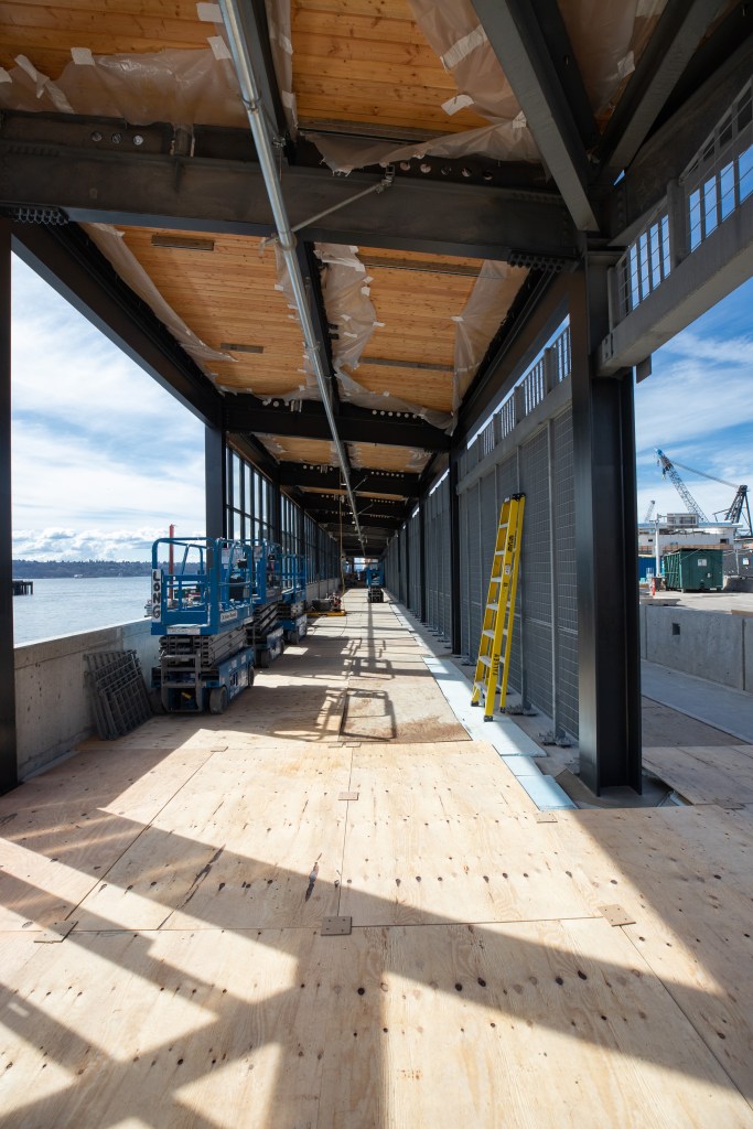 Walk down the covered walkway to reach the waiting area. Windows on the left look out over the water; the right side is screened for better air circulation. On the right the shared walkway is visible, leading to the view deck, pedestrian bridge, and the future Washington State Ferry passenger facility.