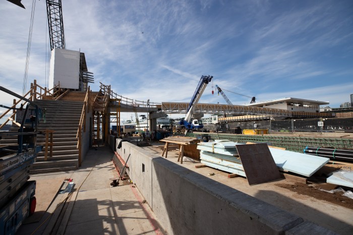 These stairs at the west end of shared walkway lead to the view deck, pedestrian bridge, and WSF passenger facility. The white structure at the top of the stairs will house two elevators. Once the connection is completed, passengers coming from the north will be able to safely cross Alaskan Way on the pedestrian bridge, walk through the WSF facility, and over to the Water Taxi – all without having to cross the street.
