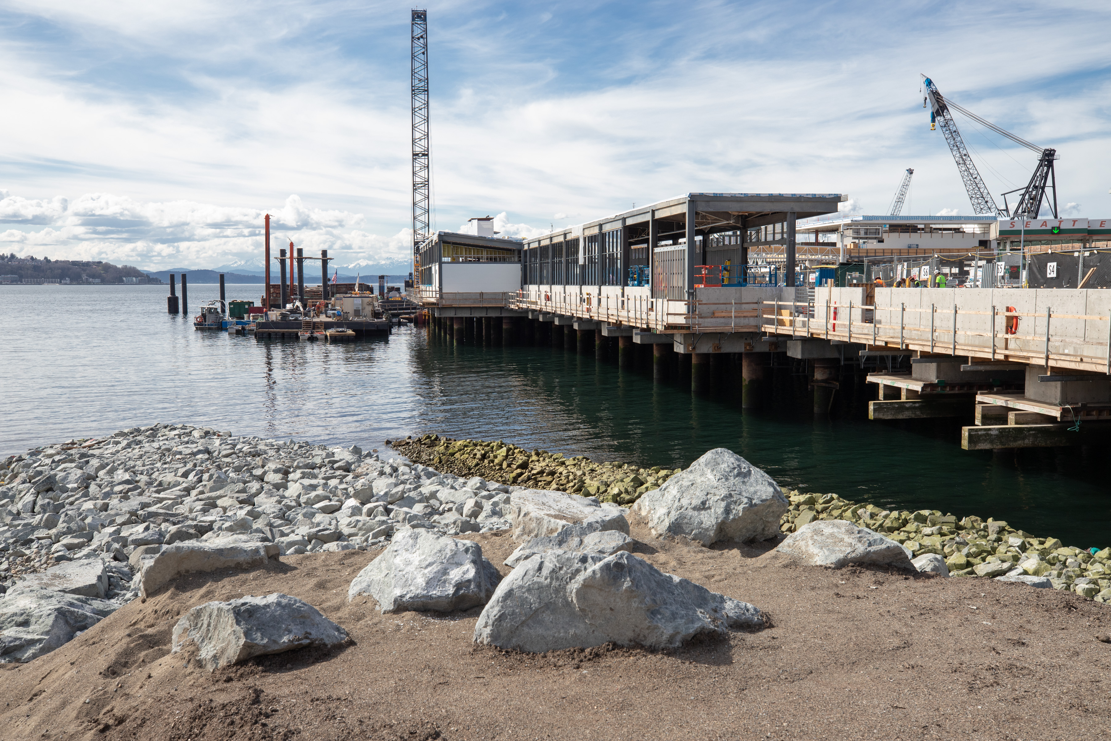 Here’s your new facility from the shore. Passengers coming from Alaskan Way will be able to walk down the shared walkway to reach the waiting area (center). The City of Seattle habitat beach is under construction and visible in the foreground.