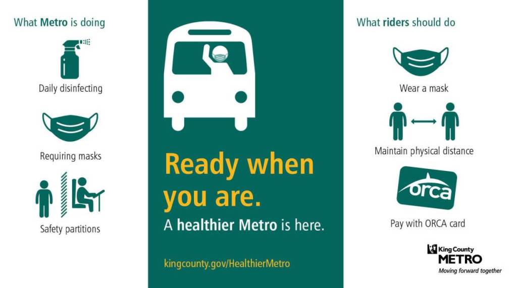 Visit the Healthier Metro page for the latest information on how Metro is protecting passengers and operators, and how riders can help protect themselves and others when riding transit.