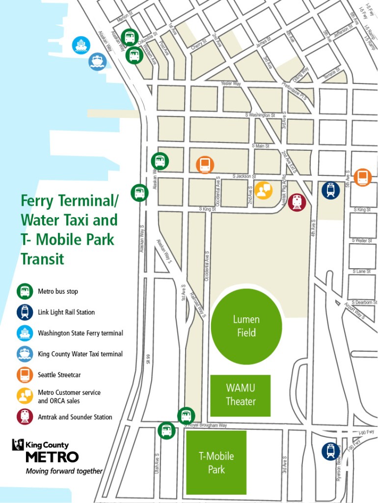 Post-Game trip home? Remember, Water Taxi service ends at 7:00 p.m., but don’t worry, after the game, take a stroll back to Alaskan Way S. at S. Jackson St. and catch a bus back to West Seattle, with RapidRide (the C and H Lines) moving you faster than Julio Rodriguez! (OK, maybe not that fast)