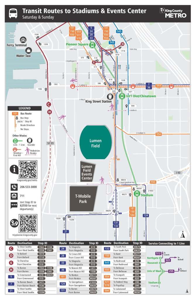 Getting home after the game? Remember, Water Taxi service ends at 7 p.m., but you can stroll to Alaskan Way S. at S. Jackson St. and catch a bus back to West Seattle, with RapidRide (the C and H Lines) moving you faster than DK Metcalf!