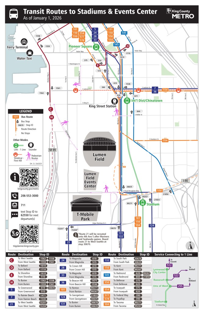 Game on! Stay informed by signing up for email or text alerts about King County Metro service, customizable to your favorite routes, on game day and every day.
